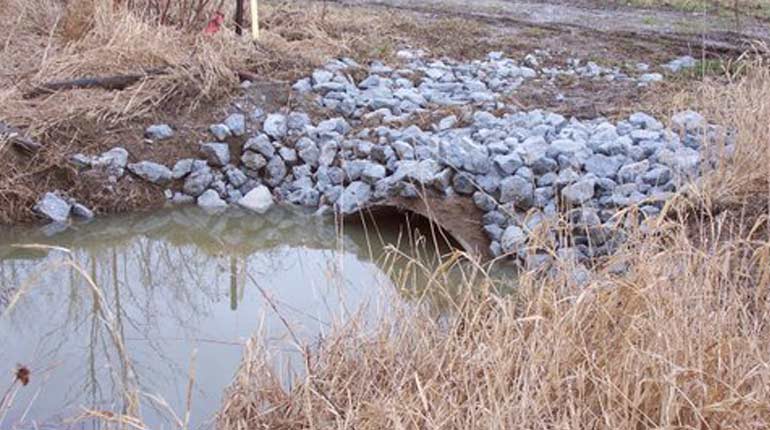 The separated pipe was forcing water around and under the second section of pipe. If not repaired, the water would eventually erode underneath the pipe possibly to the point of washing the pipe out and eroding the bank. It was determined that the first section should be removed and replaced with rock riprap to alleviate the problem.
