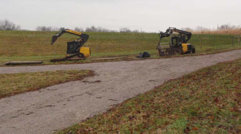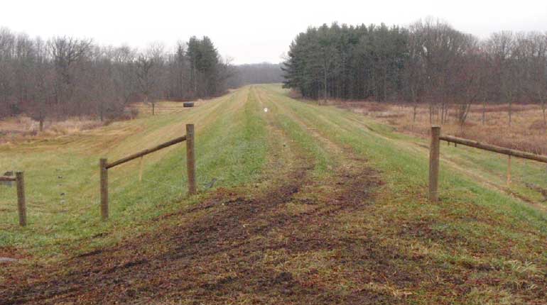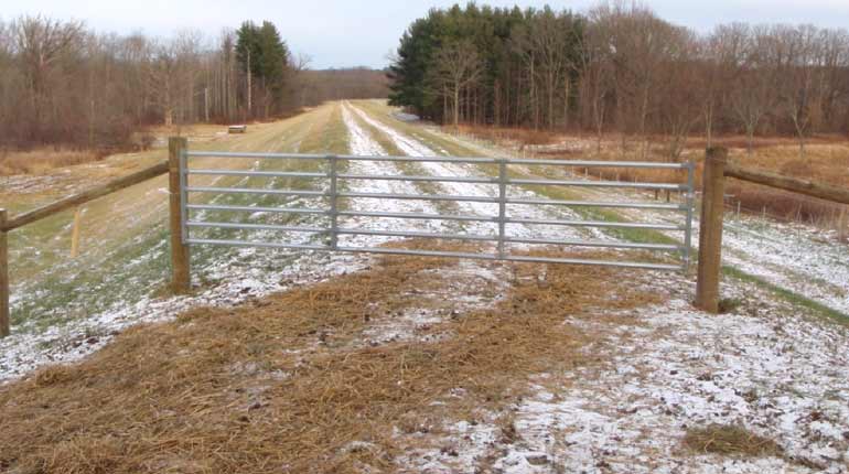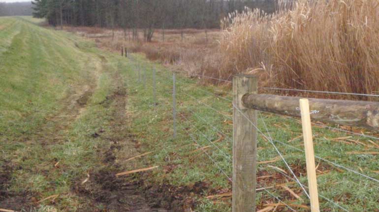 The original fencing and gates at Dam VIII-C, near River Styx, were in poor condition. All flood control dams are fenced to limit access by livestock and off-road vehicles to prevent damage to the structures.Woven and barbed wire fence was replaced with approximately 7700 linear feet of high tensile fencing, a more cost effective option.