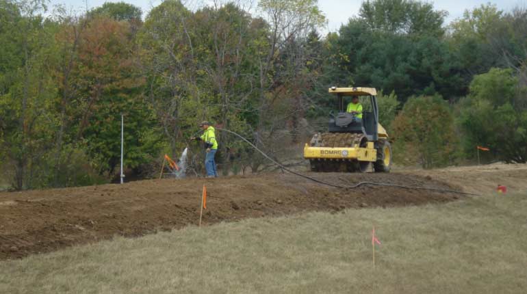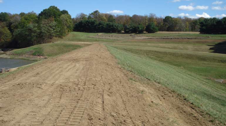 We addressed a wet area at the outside toe of the dam. 1670 feet of 6-inch drain tile was installed. 760 feet of old fencing was removed and replaced with maintenance-friendly high-tensile fence.