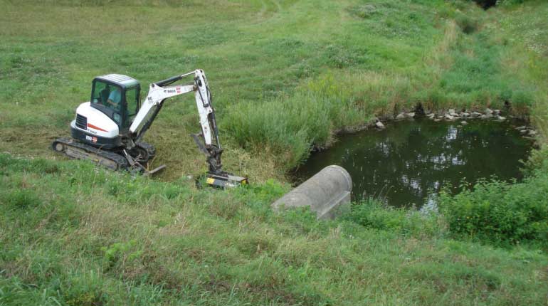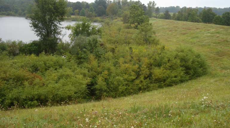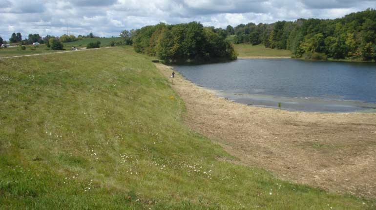 We addressed a wet area at the outside toe of the dam. 1670 feet of 6-inch drain tile was installed. 760 feet of old fencing was removed and replaced with maintenance-friendly high-tensile fence.